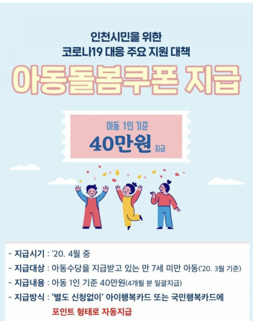 [코로나19] 인천시 아동돌봄쿠폰 지급 및 신청 방법_별도신청없이 정부지원카드 포인트로 지급
